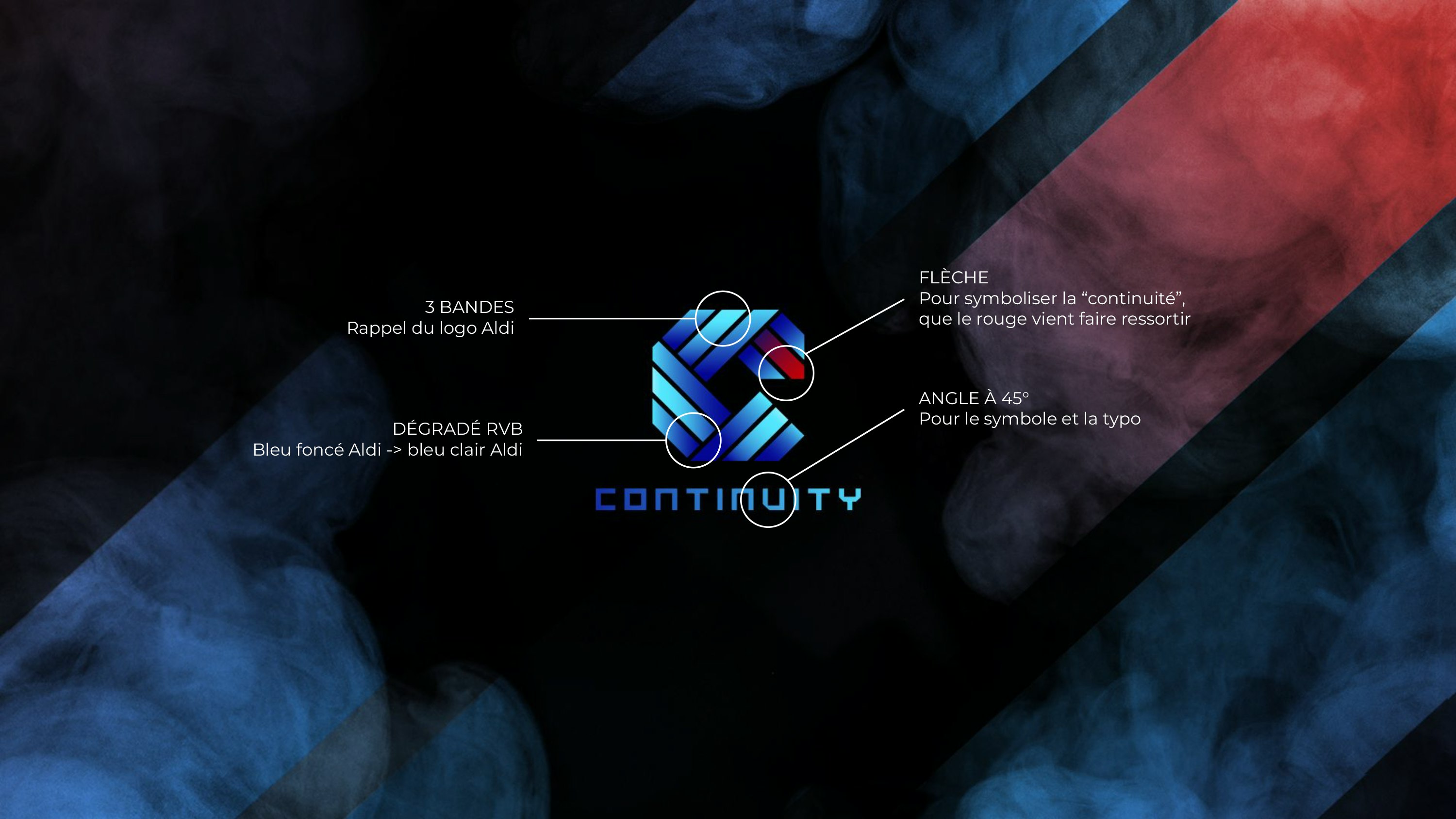 Continuity incarne les ambitions d'Aldi de prolonger son implication dans le E-Sport. Le logo prend donc la forme "C" du nom de l"équipe qui se termine par une flèche, symbole de cette continuité.