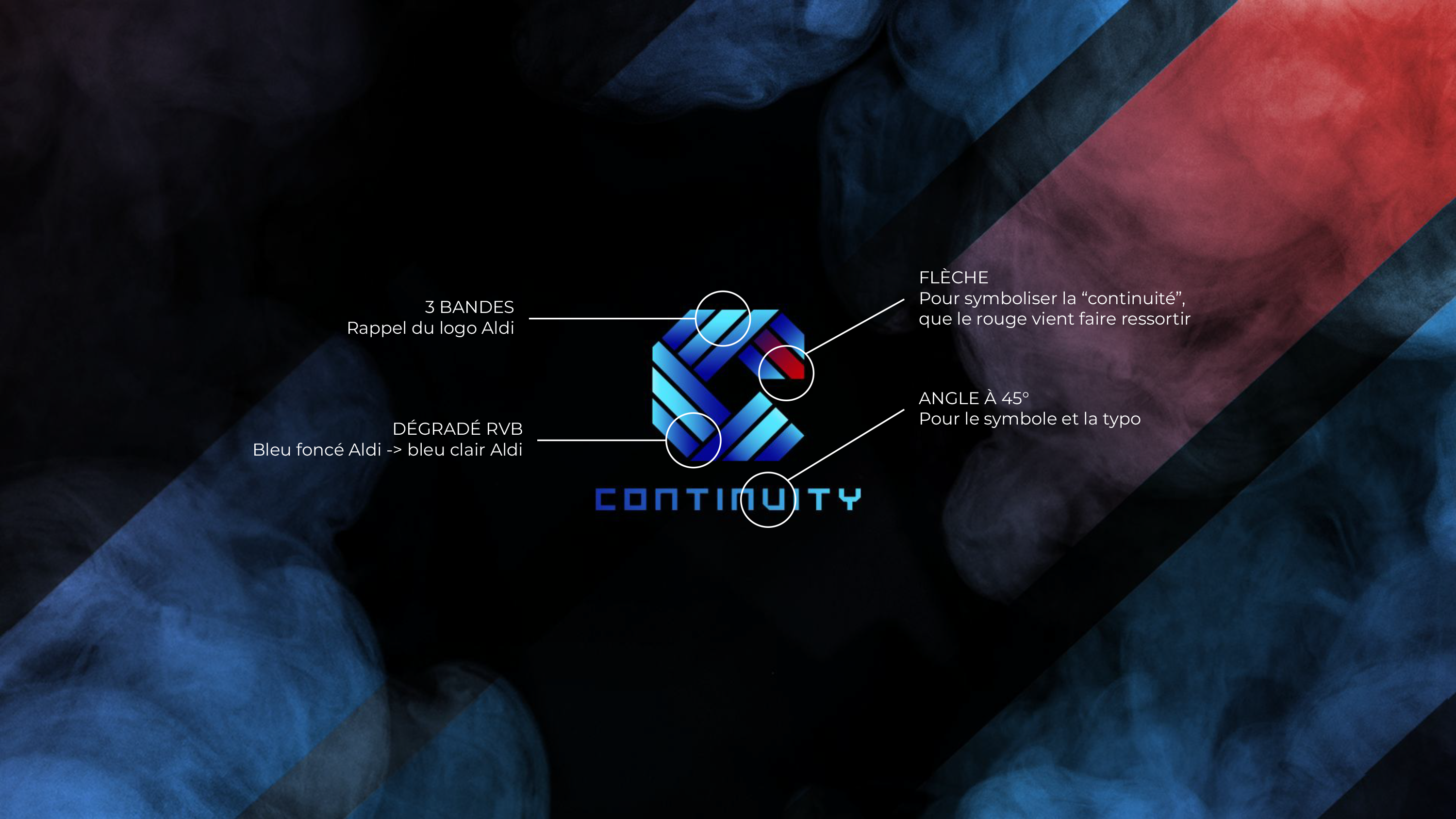 Continuity incarne les ambitions d'Aldi de prolonger son implication dans le E-Sport. Le logo prend donc la forme "C" du nom de l"équipe qui se termine par une flèche, symbole de cette continuité.