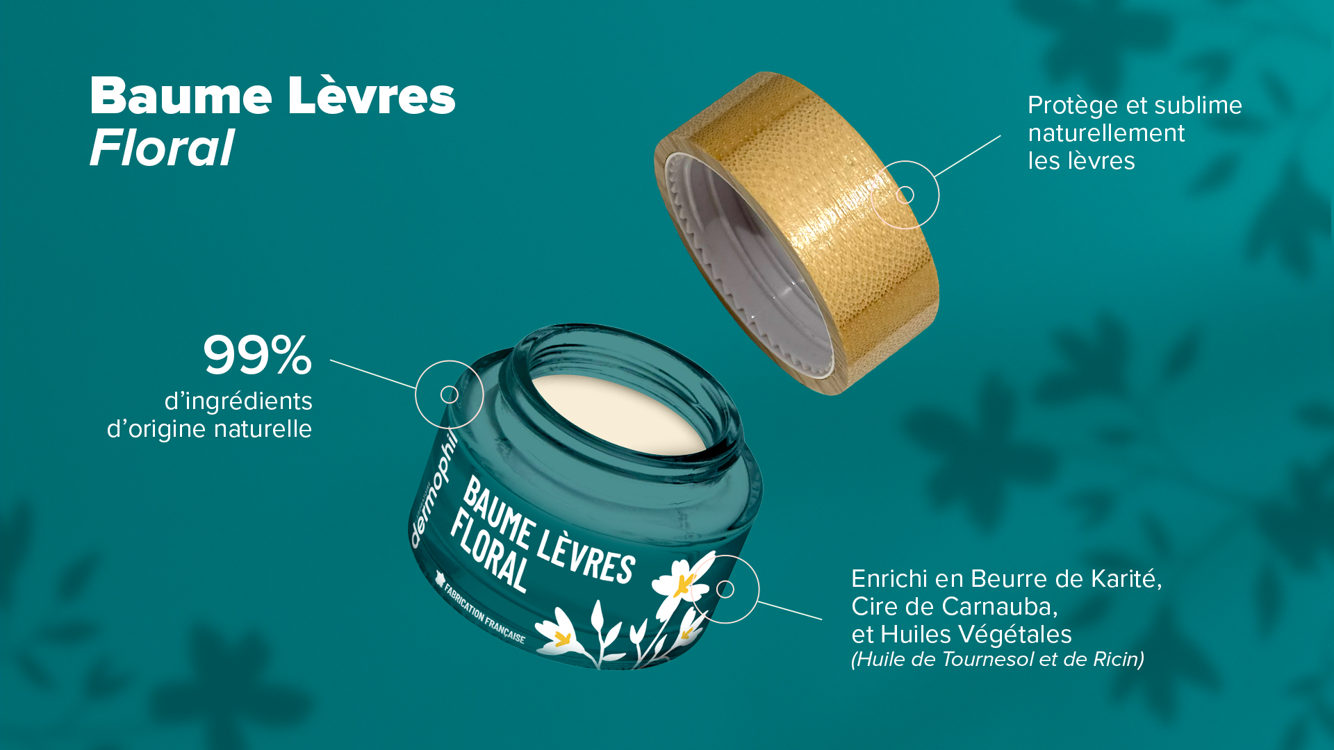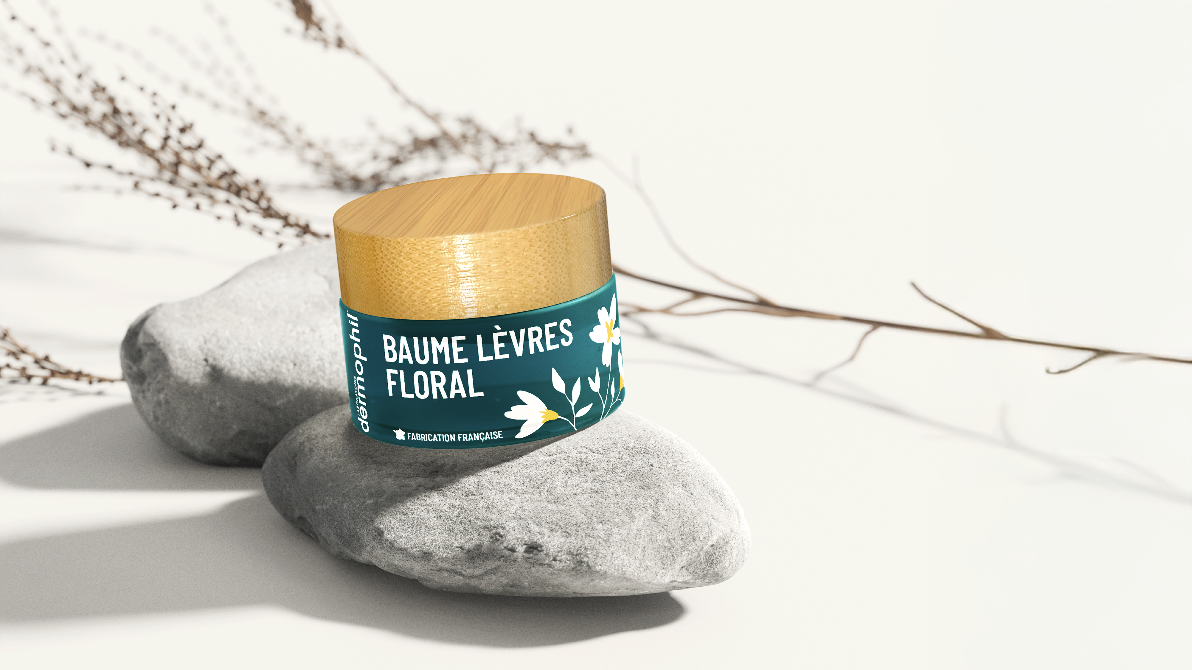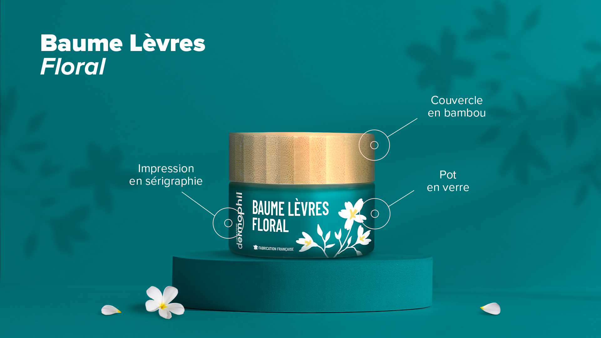 Le Baume Lèvres Floral dégage un doux parfum de fleurs des champs et offre un fini satiné à vos lèvres. Les illustrations sont fines, féminines et aux couleurs de Dermophil pour mettre en avant ce parfum.