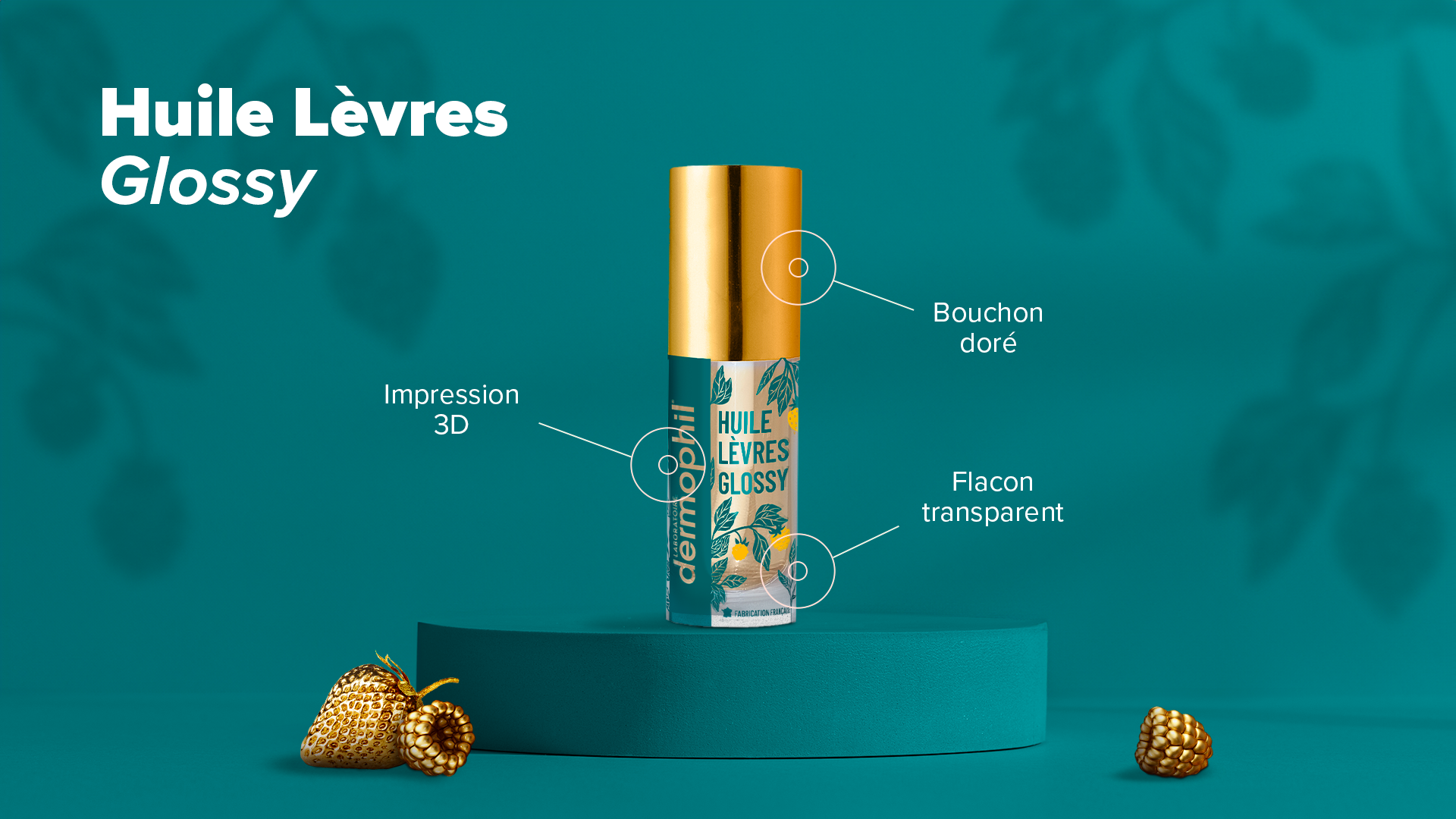 L’Huile Lèvres Glossy, au parfum fruits rouges, contient 99% d’ingrédients d’origine naturelle. D’où le choix de la transparence de son packaging : cette huile n’a rien à cacher !