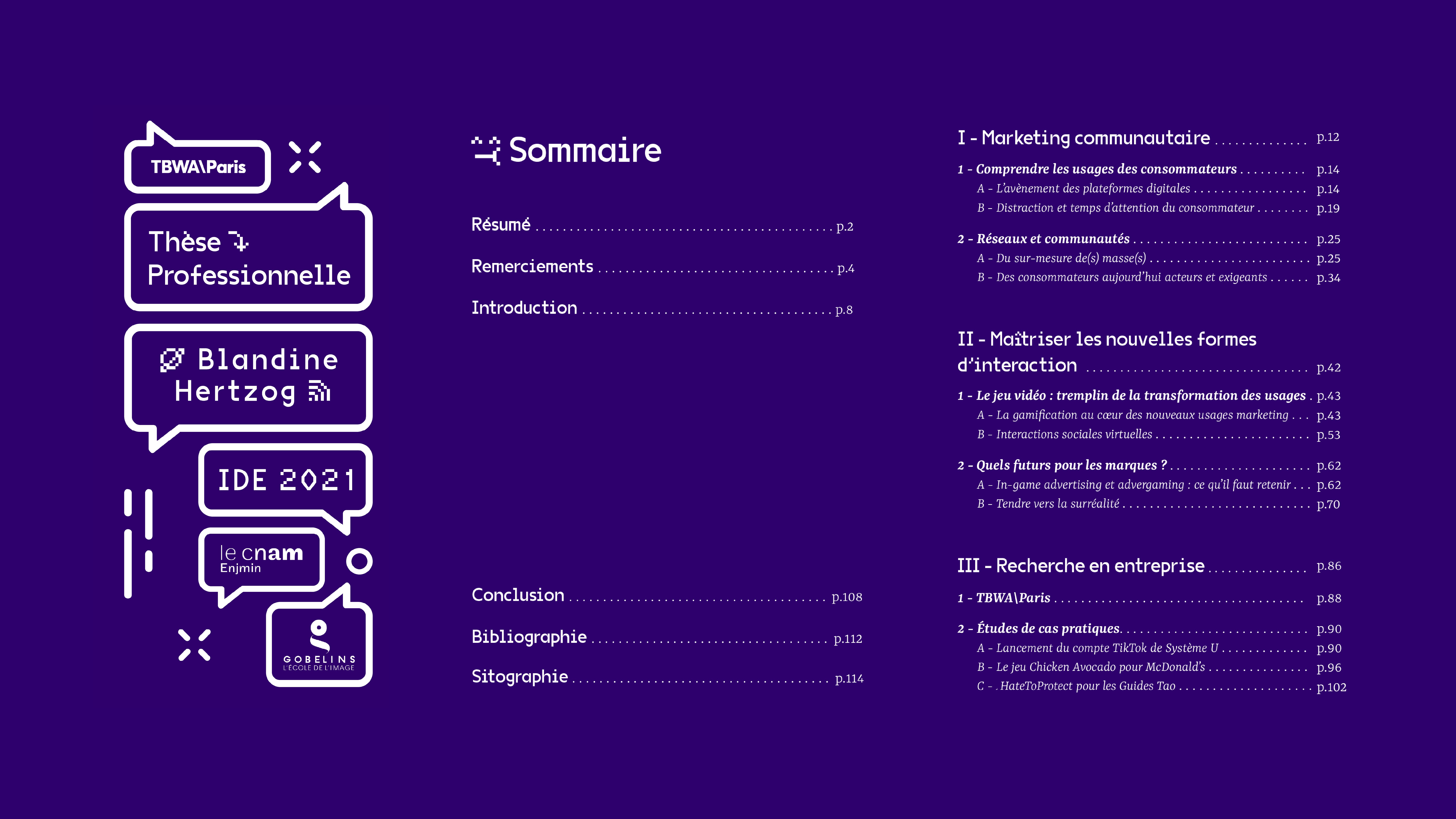 Thèse professionnelle rédigée dans le cadre de ma formation IDE à Gobelins l'École de l'Image et de mon alternance à TBWA\Paris. Cette thèse avait pour contrainte de lier le domaine du jeu vidéo et celui de la publicité.